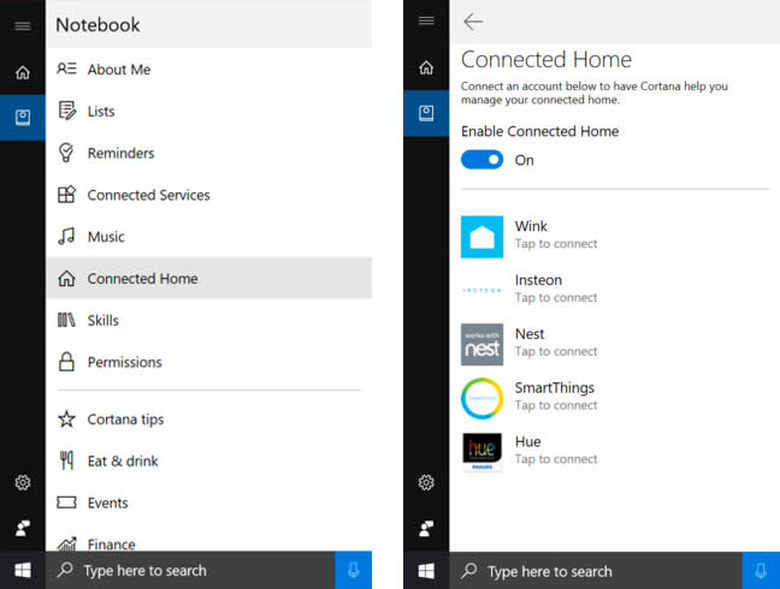 If you're using a Windows 10 computer, just type "Cortana Notebook" into the Start menu. You should see a new item called Connected Home. After you enable this, Cortana can connect to smart home services like Hue, SmartThings, Nest, Insteon and Wink. These are the only five options available at the moment. I was able to sign in to my Hue account, but Cortana kept pulling up Wikipedia search results when I asked her to turn on my lights. That failure to communicate with Hue is something we've noticed before, so you might have better luck with the other four services.