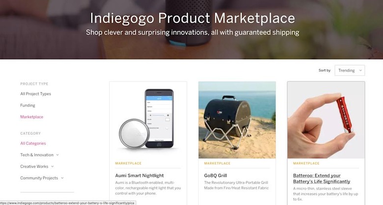 The marketplace section's homepage currently has a smart nightlight, an ultra-portable grill, a battery-life extender sleeve, a smart VPN router and a STEM learning project box for kids and hobbyists, among others. You can filter the marketplace view by category, like Tech & Innovation, Creative Works and Community Projects, too. Each of these larger categories have several sub-categories, as well, like Art, Comics, Film, Music and Video Games under Creative Works. You can also filter what shows on the marketplace page by whether the crowd-funded projects are "just launched" or "ending soon." If nothing else, Indiegogo is now a place that project creators can sell their stuff to folks who didn't get in on the initial funding phase.