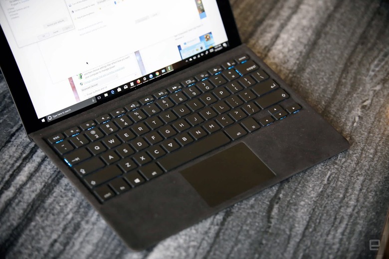 Then there's the keyboard, which I'm generally fond of. After using a 2016 MacBook Pro, with its flat key switches, the Eve keyboard's key travel feels like a return to sanity. There are a few novel flourishes here, too, including a backspace key that says "oops" and the ability to toggle between seven different backlight colors for the keys. The trackpad is a little small for my liking, but it gets the job done. The whole thing is coated in Alcantara fabric, too, though it's much plusher than the kind Microsoft uses for its Surface keyboards. It's softer, which is nice, but the material also makes the keyboard more prone to catching crumbs, lint and dust. Learn from my mistakes and don't eat your lunch over it.