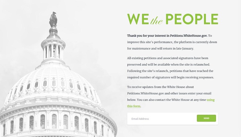 The "We the People" site was launched back in 2011 as a way for the rank and file citizens to get a response from the Obama administration if they were able to get 100,000 signatures on any given petition. The site will now be unavailable until late January, and the Associated Press reports that all existing petitions and responses will be restored next year.