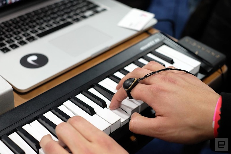 The "connected ring" essentially functions as a responsive MIDI controller that can function with or without a laptop. Tilting your hand up and down modulates the volume while rolling it from side to side creates pitch bend or vibrato effects. Combining gestures means the effects combine, too. The team says they'll add more gestures in the future — which are received through nine sensors — while any number of musical effects can be programmed by a user.
