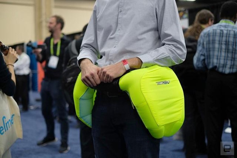 French company Helite has been selling wearable airbags in some shape or form for many years. Typically, it's targeted bikers, horse riders, light-aircraft pilots and other people with dangerous hobbies. This year at CES, it's pitching the Hip'Air, a 2.2-pound belt that detects when an elderly person is falling and deploys an airbag. A typical fall, a Helite spokesperson explained, takes 400 milliseconds. Using gyroscopes and accelerometers, the Hip'Air can detect a fall within 200 milliseconds of it beginning. The belt will then begin to deploy its built-in airbag, which takes a further 80 milliseconds.