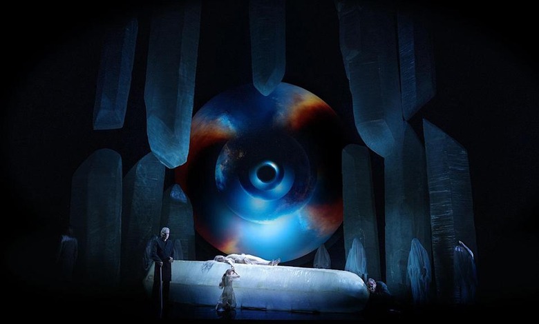Brambilla used collages of Hubble and NASA images to create the backdrop. "Both the libretto and the music have always screamed of the cosmos to me," Brambilla said. "Since the text deals with the recurring theme of the eyes and sight, Marina Abramovic's set design uses seven monolithic crystals and an onstage projection disc as the pupil of a symbolic eye. This becomes a portal into the subconscious where my videos unfold and heighten the tension and drama unfolding onstage."