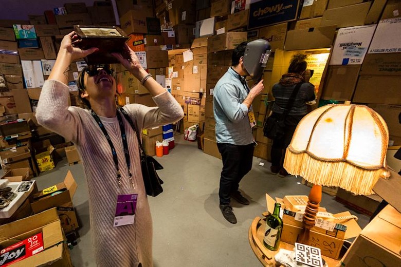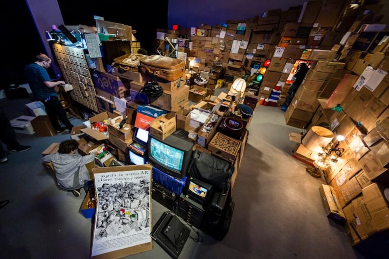 Who doesn't enjoy digging through piles of old junk at yard sales? They're a window into the past, capturing lives and forgotten memories. At the Tribeca Film Festival, the installation Objects in Mirror AR Closer Than They Appear takes that concept to the next level. At first, it just looks like a random assortment of trash and old gadgets. But after donning a pair a custom pair of augmented reality goggles, built out of the shells of antique stereoscopes, you'll discover hidden videos and experiences tied to each object.