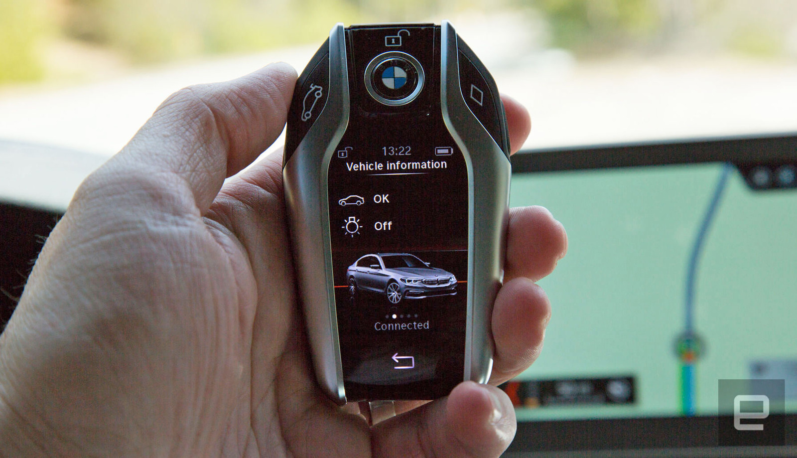 The Display Key with its tiny touchscreen basically replaces a lot of the features found in a car's companion app. Drivers can lock and unlock doors, set the temperature in the car and check on their fuel level from a range of about 980 feet.