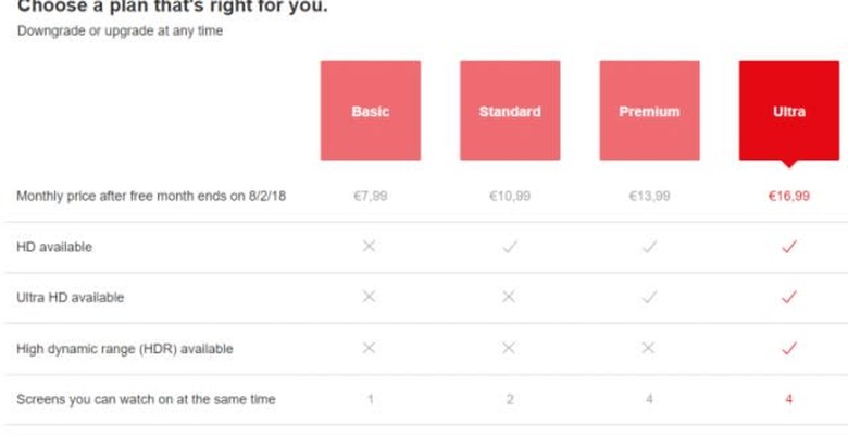 With Netflix adding new original content at a breakneck pace, it only makes sense that another price adjustment is around the corner. The company confirmed tests of an Ultra tier that some European users have seen offered. Nothing's set in stone, yet, but right now the 16.99 Euro option allows for 4K, HDR and up to four streams at once. That means some of those features are pulled from the current lower-priced standard and Premium plans. If this rolls out widely, we'll have to wait and see if existing users who enjoy simultaneous streams and HDR at current rates get grandfathered in.