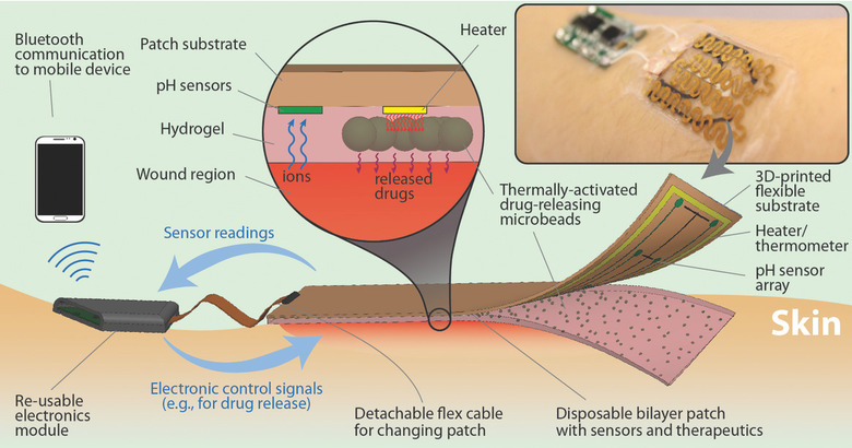 The smart bandage can monitor both temperature and pH of the wound. If it detects a change, it can diagnose the problem and dispense drugs as necessary, thanks to a central processor, which a doctor can program to administer treatment if certain conditions are detected. "A stimuli‐responsive drug releasing system comprising of a hydrogel loaded with thermo‐responsive drug carriers and an electronically controlled flexible heater is also integrated into the wound dressing to release the drugs on‐demand," the paper says. The bandage will also monitor treatment to determine if further steps are necessary. It can also provide real-time status updates via Bluetooth.