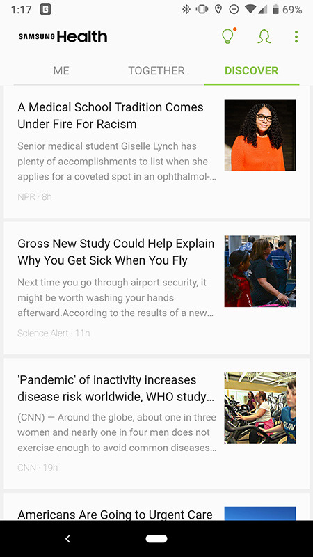 If you're forgetful like me, it helps that the Watch can also automatically recognize and start tracking certain exercises — think running, cycling and the like. It's helpful that the feature exists, but I wouldn't rely on it. In my experience, it doesn't start tracking walks or runs until long after they've started. Really, the biggest shame is that all this helpful information winds up in Samsung's S Health app, a bit of software that sometimes doesn't make sense. Need proof? Swipe far enough to the right and you'll find a section for health stories culled from Flipboard, a longtime Samsung content partner. The right health-related content could easily prove inspirational, but instead, I got a bunch of stories about salmonella outbreaks and Stephen Colbert's anxiety. Uh, great, I guess?