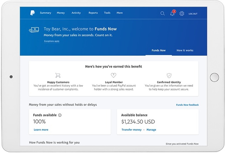 PayPal is adding a new feature for businesses that use its platform for their sales. Funds Now will let certain businesses in good standing — that means without fraud concerns or an excess of customer complaints — get instant access to funds from completed sales, even if there's an ongoing dispute. The company says that one of the biggest complaints from small businesses has been delays in accessing funds, which are sometimes upwards of 21 days long. Funds Now eliminates that wait by getting rid of any holds, delays and reserves on that cash.