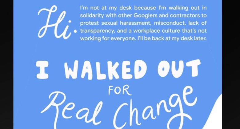 After stories of harassment, misconduct and light punishment or golden parachutes for high-level execs, some Google employees are protesting. At 11:10 AM local time, participants are walking off the job and leaving a flyer behind that cites demands including an end to forced arbitration, a commitment to end pay and opportunity inequity, a publicly disclosed sexual harassment transparency report, and more.