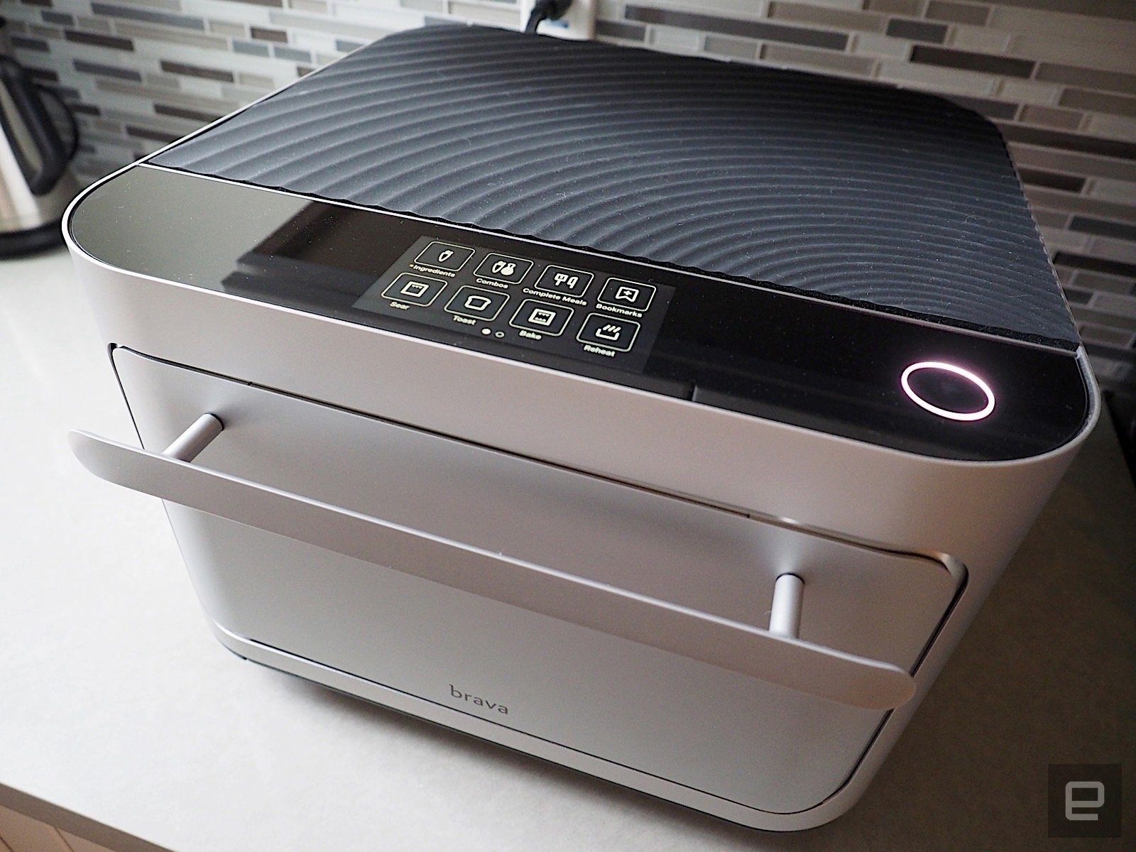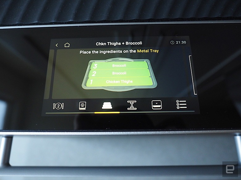 Also on top is a thick glass edge that houses a single start/stop cooking button plus a five-inch touchscreen display. That's where the rest of the oven's controls are. They include options for searing, toasting, baking and reheating as well as a slew of cooking presets for hundreds of foods. Simply choose what you're cooking — say, asparagus or half a chicken breast — and it'll walk you through instructions on how to cook them. For meats and fish, Brava recommends that you use the included probe thermometer that plugs into the side of the oven so that the proteins will cook to the desired temperature.