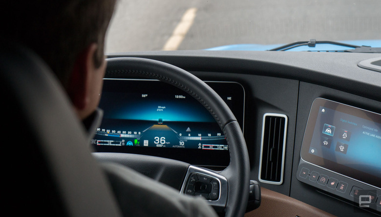The giant diesel engine growled as it downshifted after an SUV stopped in front of it. After about a second the SUV proceeded and the new Cascadia lurched a bit and followed. Daimler says the system will re-follow traffic after its come to a stop for two or less seconds. After that, the driver will have to tap the accelerator or use the resume button on the steering wheel.