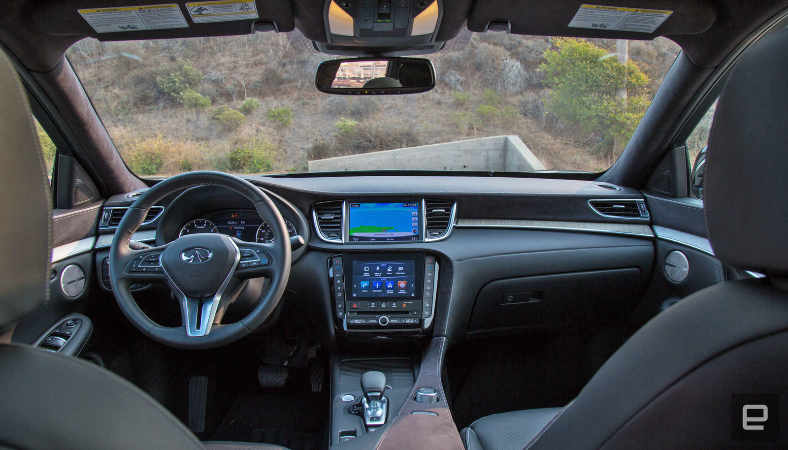The interior tech though, that's a different story. The infotainment system uses two displays — the top one is for navigation while the bottom serves as the touchscreen control panel. First off, it doesn't support CarPlay or Android Auto — a huge bummer. Secondly, the top display doesn't seem to have as high a resolution as the lower one which is just weird. Overall, the whole thing feels dated. Fortunately, Infiniti says it's working on a new infotainment system that'll arrive in 2021. So I look forward to trying that out.