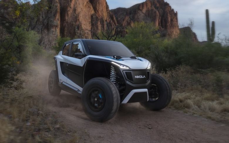 Next up was Nikola's Water Adventure Vehicle (WAV), an all-electric jet-ski style personal watercraft, followed by the NZT ("net zero toll") Off-Highway Vehicle. This flagship sports vehicle has all the markings of a powerful off-road dune buggy (590 horsepower no less) with a luxury finish. The cabin is completely sealed off from the elements, so you won't have to worry about getting sweaty or sandy as you rev from 0 to 60 miles per hour in four seconds for a full battery range of 150 miles. This is a beefy toy that doesn't come cheap, though — when it goes into production in 2021 it'll come with a starting price of $80,000.