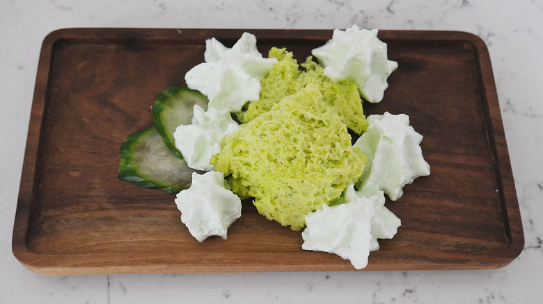 While the cake cooled, I whipped more hot pickles into cream, which aerated gorgeously, though I have to say it was more like the sturdy whipped cream from T.G.I. Friday's than the flimsy foam from El Bullí. I plated it like a pro, complete with slices of pickle garnish.