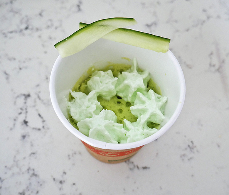 I started out creating a hearty dinner of pickles. I sliced up half a cucumber and brought my vinegar-and-herb brine to a boil, as I would to make the traditional variety. But rather than plopping a dozen or so slivers in a jar and waiting, I plopped them straight into my siphon, turned it on its side for a few minutes, then let all the gas out of the tank. The quick expansion when you add gas to the siphon breaks up the cucumber's tissue, and when you release the gas, the brine rushes into those broken spaces. I opened it up and... pickles! Fresh and crunchy.