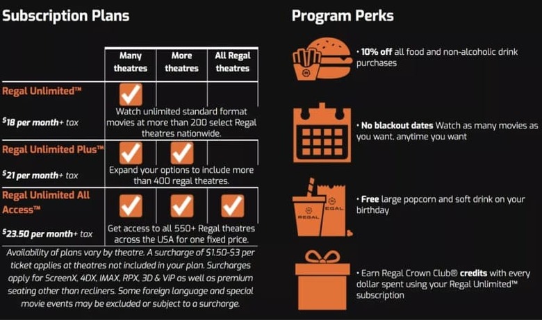 Regal Unlimited offers three tiers of membership, ranging from $18 to $23.50 per month (plus tax), and you'll have to download the free Regal App to participate. The "gotcha" is that there is a $0.50 convenience fee for every movie you book through the app, and surcharges apply for special features like 4DX, IMAX, 3D and double features.