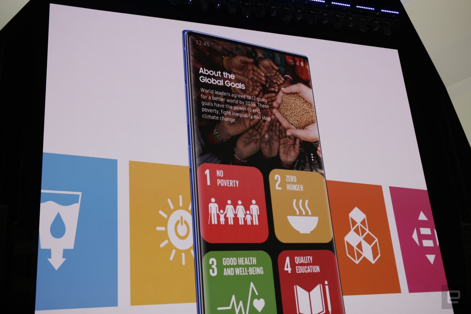 Today's Samsung event wasn't just about new gadgets. Near the end of today's presentation, Samsung president DJ Koh announced a partnership with the United Nations Development Programme (UNDP) as a way of putting more focus on the organization's Sustainable Development Goals, or the Global Goals for short. Specifically, Samsung is releasing a Global Goals application that'll come pre-installed on the Galaxy Note 10 series and will be available on other Galaxy devices soon.