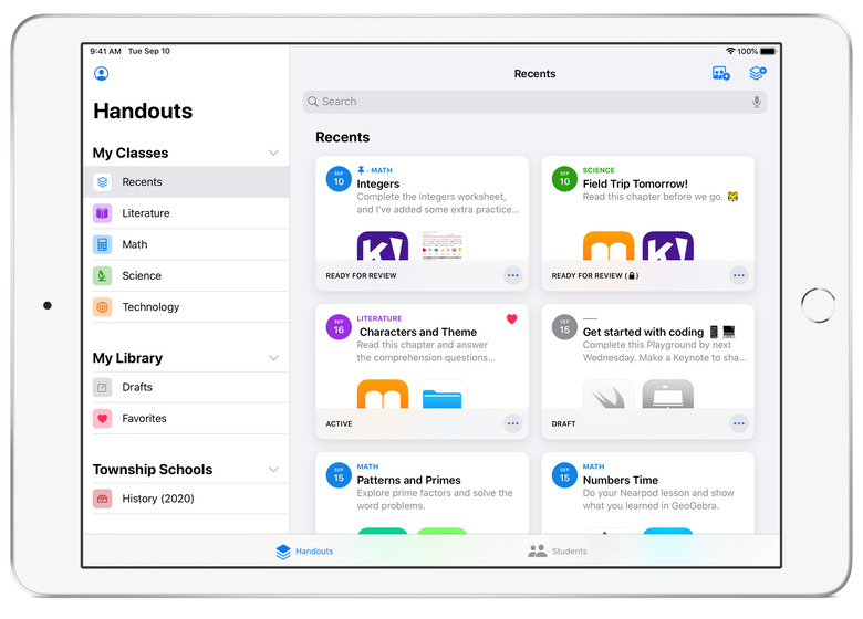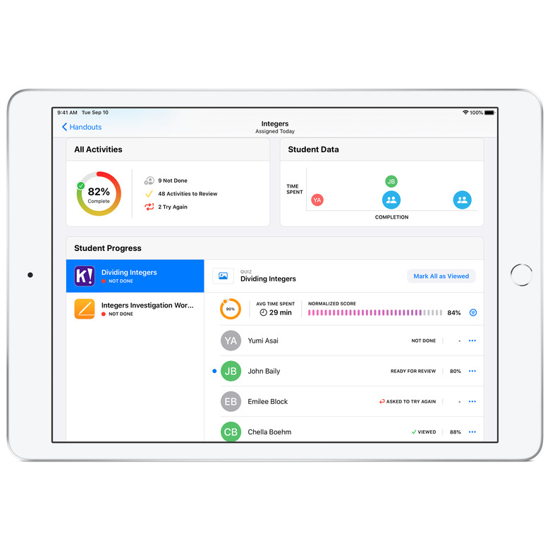 Teachers can also now tap into individual assignments and view each student's progress and how much time they are spending on the work, compared with the rest of the class. While these changes would be helpful even in the normal classroom setting, it could provide teachers valuable insight as students are working remotely. If one student is taking significantly longer to finish an assignment, or finishing much more quickly than the rest of the class, that could let the teacher know they need extra help, for example. Teachers will also now have the ability to message or FaceTime students via the Schoolwork app in case they need more one-on-one attention.