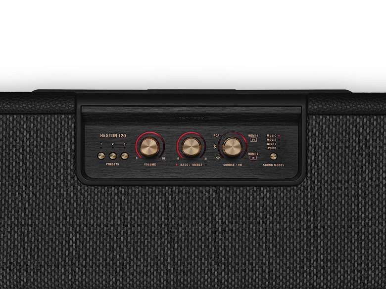 The Heston 120 takes design cues from Marshall's line of guitar amps. This has been the case for the company's headphones, earbuds and speakers, and it will continue with soundbars. To that end, there's a mix of leather and metal, complete with the trademark gold script logo. There are also tactile controls you typically don't see on a soundbar, like the gold knobs and preset buttons akin to those that adorn an amplifier.