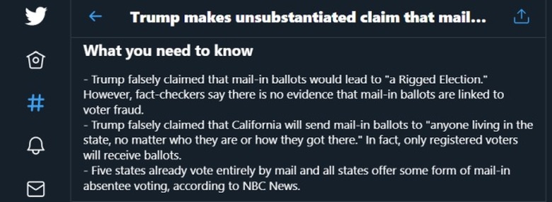 Maybe you never thought it would happen, but Twitter's new fact check feature is being used on some of Donald Trump's latest tweets, noting that they might contain false information. Twitter has appended a link urging users to "get the facts" about mail-in ballots. Clicking through, Twitter further notes that fact checkers say there is no evidence to support Trump's tweeted claims about fraudulent mail-in ballots. It added that voting by mail is already used in a number of states, and it linked to stories from CNN, The Washington Post and other outlets debunking these claims.