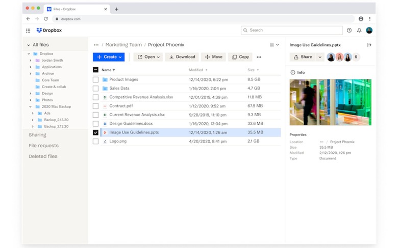 In its web client, meanwhile, Dropbox is introducing several interface tweaks. The most significant of those changes is the addition of a new tool that allows you to convert files to different formats without leaving the client, with JPEGs to PNGs as one example. Elsewhere, Dropbox says a redesigned details pane makes it easier to see important information about your files. The company claims it has also made it faster to jump between different folders with a new side navigation bar.