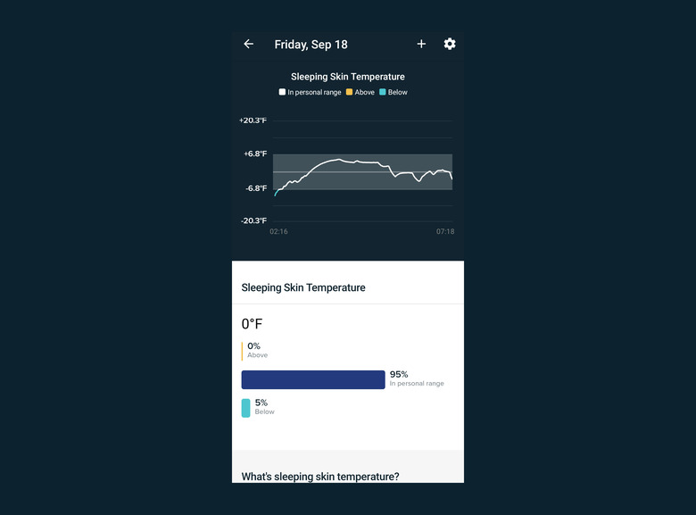If you do, though, the Sense has the potential to help catch when you have a fever, as well as detect the start of a menstrual cycle. After my third night, Fitbit reported no overall changes, which isn't surprising since it's the first result. (You'll need the three evenings of data before it delivers the first report.) While it doesn't give you a reading of your actual skin temperature, the Sense can tell you how it fluctuated as you slept, and it was interesting to see how I grew warmer as I fell deeper into sleep, then cooler again. Though this data isn't immediately useful, I could see it alerting me to the onset of fever or an illness.