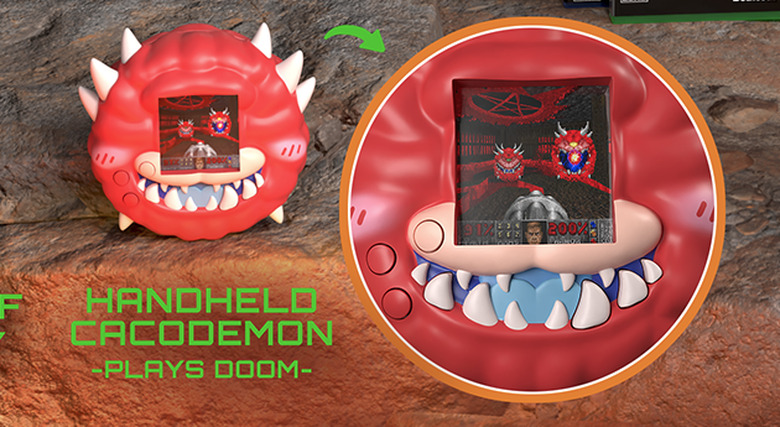 It comes with a couple of toys based on one of the franchise's most iconic enemies. There's a detailed three-inch Cacodemon that connects to a five-inch base, which looks pretty nifty. There's a smaller handheld Cacodemon that, you'll never guess, also runs Doom.