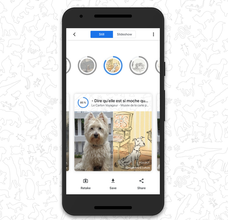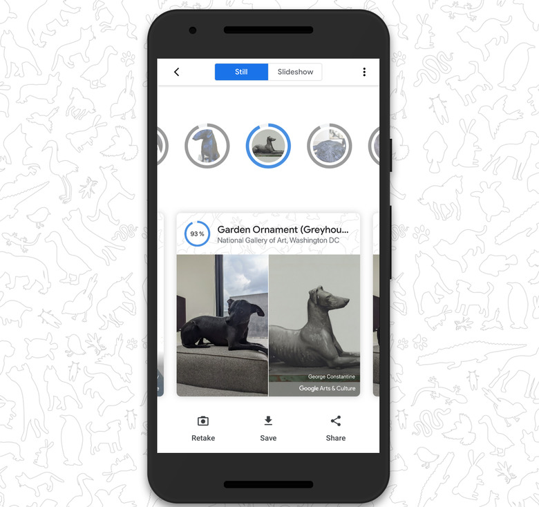 You can share your Pet Portraits as still images or choose a few of them to turn into a GIF slideshow. To get started, tap the rainbow camera button at the bottom of the screen on the Google Arts & Culture app, which you can download on iOS or Android.