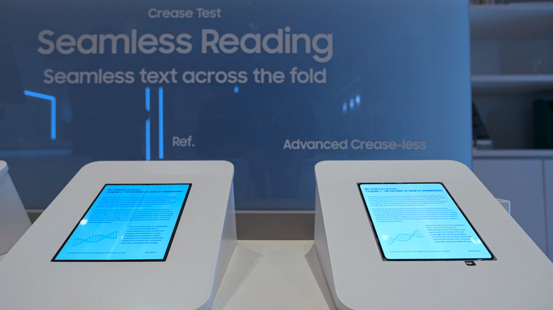 The "seamless" foldable display that might be a part of a future foldable iPhone disappeared from the booth during our tour, reappearing when it was time to leave. (This is an image provided by Samsung Display.) The device was labelled as an R&D concept, but it somehow disguised the crease in the center of the main display, making the (unlabelled) Galaxy Z Fold on the left look like a messy first-iteration foldable. There's still a crease there Will it actually form part of Apple's foray into foldables, or just part of the Z Fold 8?