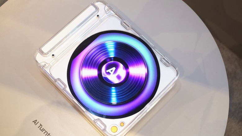 This isn't a record player you'll ever buy. You don't need an OLED display on the side of your wireless headphones, but you could have them. I liked the cute OLED pendants; a customizable near-future button badge, but a lot of this is just devices for the sake of making them.