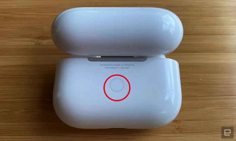 2. With your AirPods in the case and the lid open, bring them near your Mac and press and hold the button on the back of the case until the light on the front flashes white.