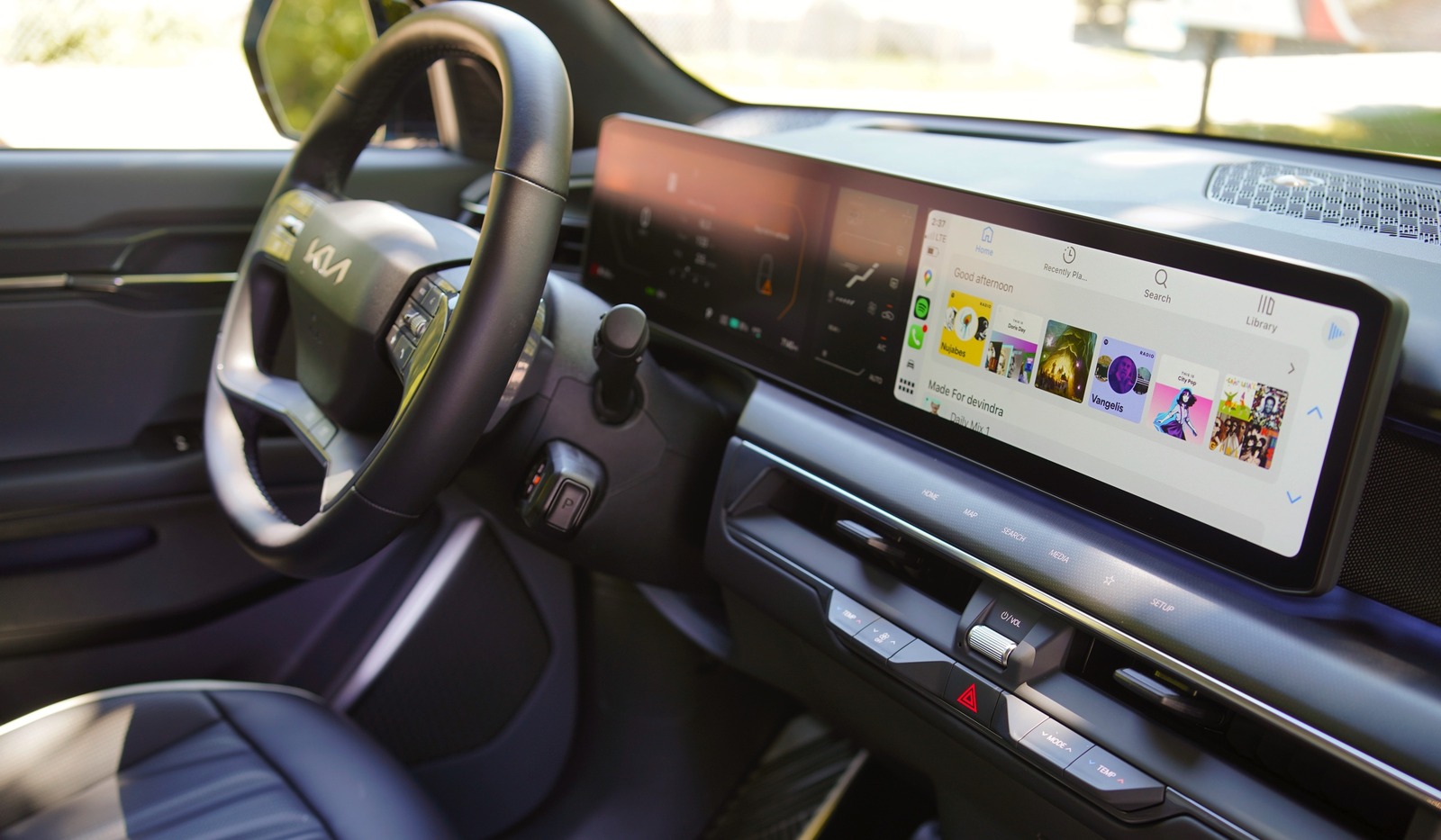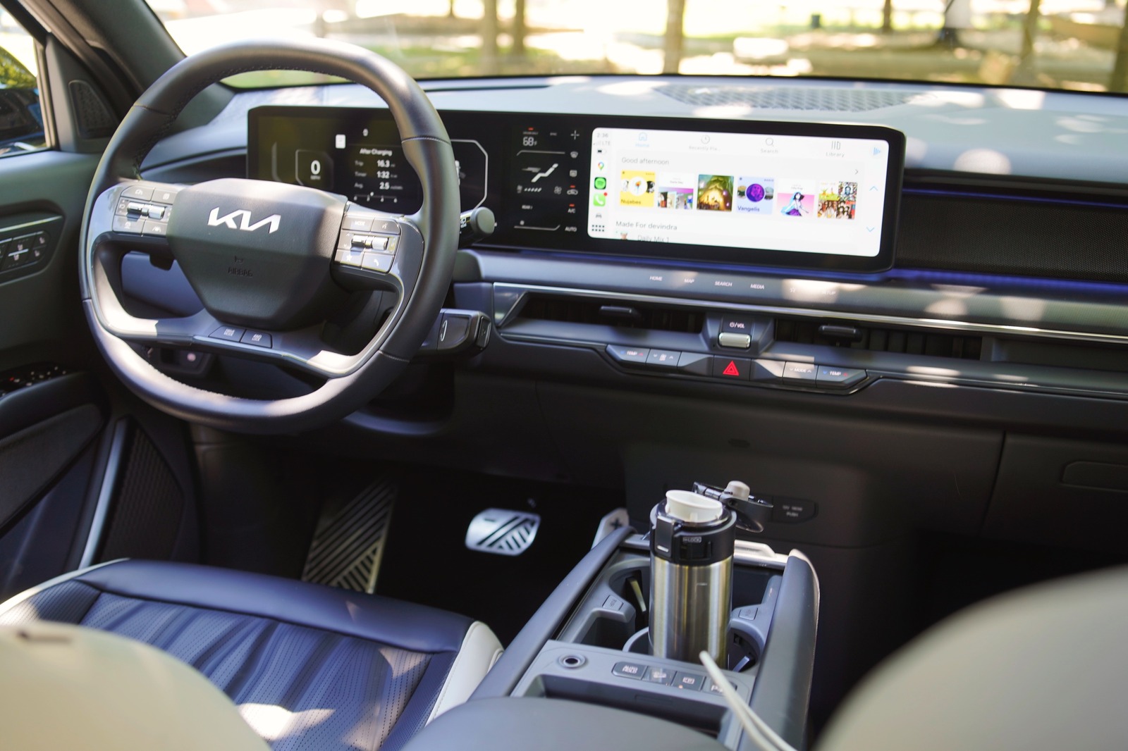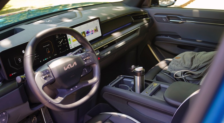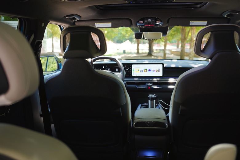 Upon opening the driver side door, you're greeted with an elegant setup: well-cushioned seats with comfortable mesh headrests; Kia's 30-inch "Triple Panorama Display," which features a gauge cluster, HVAC controls and a 12.3-inch infotainment screen; and tons of clean and usable space. It's similar to the EV6's setup, but a bit less cluttered since gear controls are handled by a stalk on the steering wheel, instead of a dial by the cupholders.