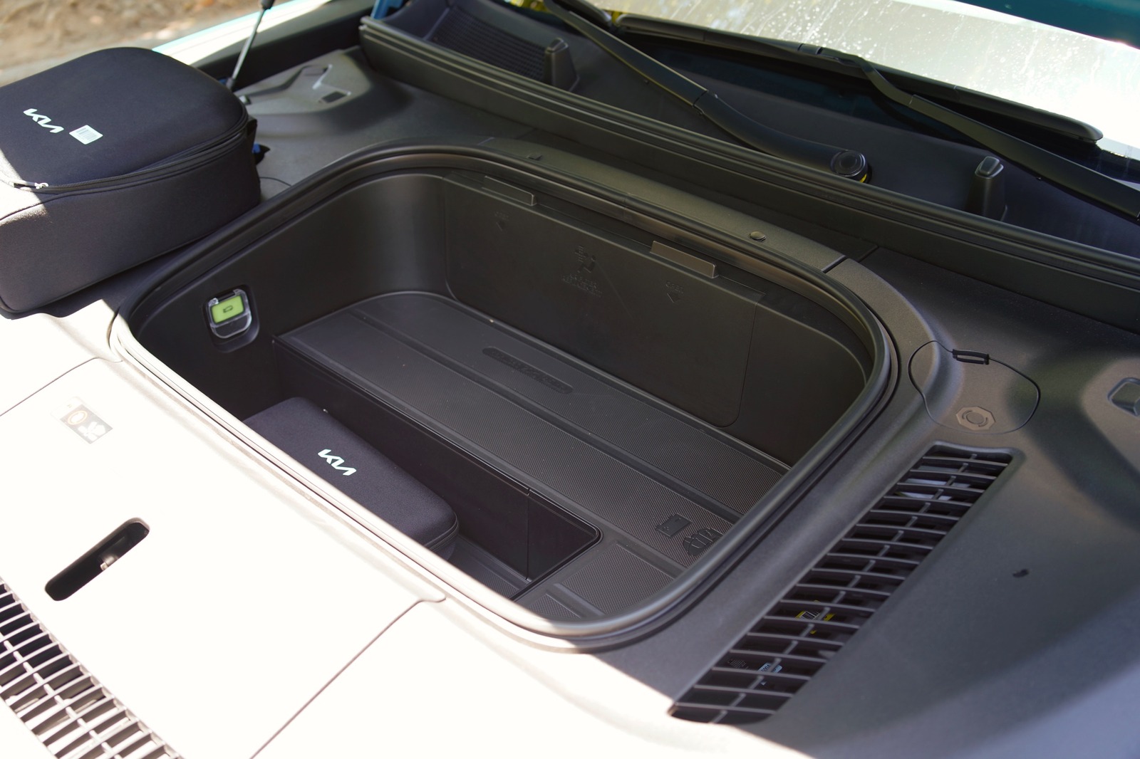 For cargo, the EV9 sports 20.2 cubic feet behind its third row seats, and a more usable 43.5 cubic feet of storage when the third row is folded flat. If you push down the second row seats as well , you can fit in up to 81.7 cubic feet of gear. There's a front trunk, or frunk, underneath the hood too, but it's not as useful as other EVs. It can hold 3.2 cubic feet in the rear-wheel EV9, and an even more minuscule 1.8 cubic feet in the all-wheel drive models. In both cases, you have just enough room to hold Kia's level 1 charging cable and a few other small items.