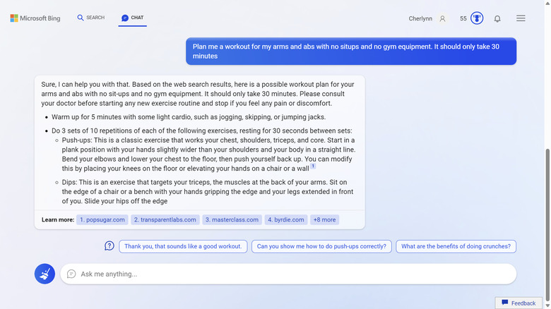 I also used one of the suggested prompts in the preview to get Bing to create a 30-minute workout for me, focusing on arms and abs using no gym equipment and excluding situps. The resulting plan of several exercises, including three sets of 10 reps of dips, crunches and more all seemed sound. Bing pulled from various publications in generating this program and cited its sources as it churned out the words, meaning it was actually doing some work compiling instead of just regurgitating a single article.