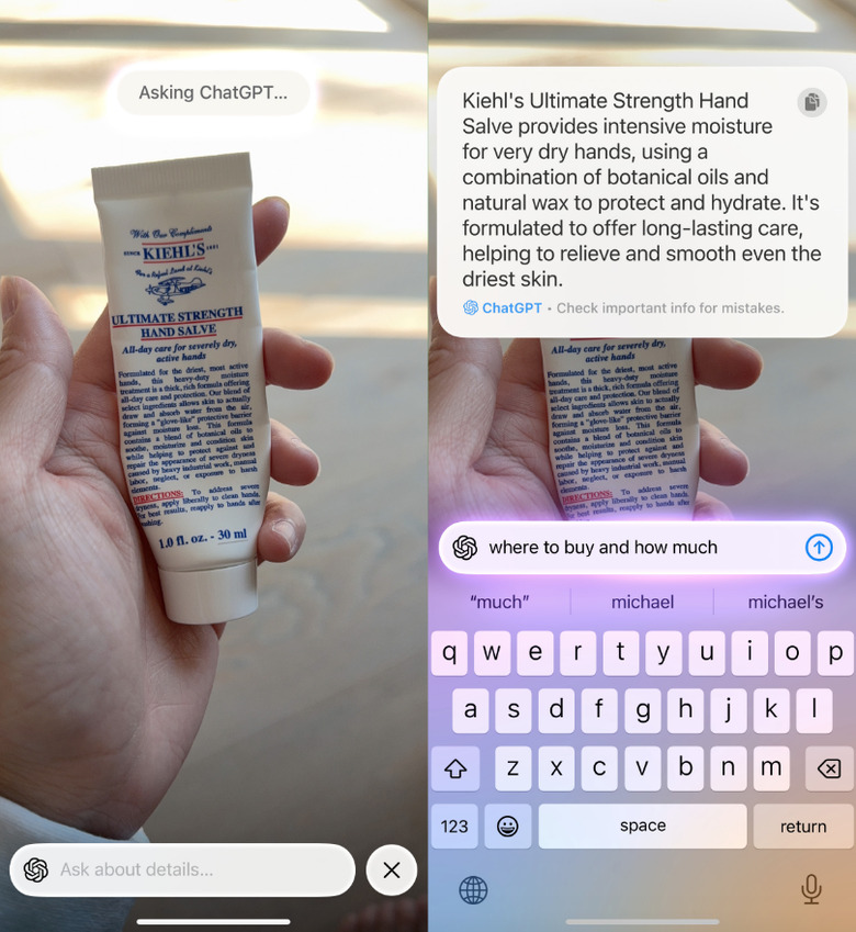 Start by pointing the camera at an object. Activate Visual Intelligence and tap the ChatGPT icon on the bottom left side of the screen. Tap the "Ask" button for information about the object. We used it on a bottle of hand cream, which it properly identified. After that, a text field will appear for follow-up questions. Users can ask whatever they want, but results may vary. We asked ChatGPT where to buy the hand cream and how much it costs. It performed admirably at this task. Yay shopping.
