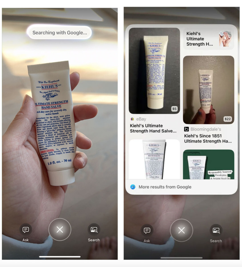 Choosing Google Image Search will bring up a Safari dialog box that contains similar photos pulled from the web. A good use case here is finding deals. We took a photo of a bottle of hand cream and the Safari results had plenty of different price points to choose from. However, users have to find the best deal and complete a purchase on their own.