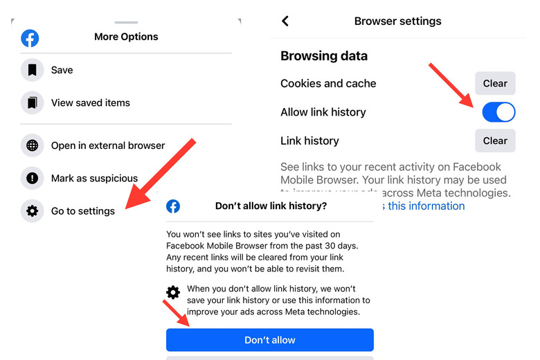 On Facebook, users will need to open a link from within the app and tap on ... menu to open the settings from the in-app browser. Then, look for the "link history" toggle. If it's on, you'll need to turn it off, and then confirm via the pop-up that you want it disabled.